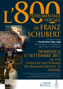 Novara - L’Associazione Erato,con il sostegno della Fondazione Comunità Novarese Onlus, promuove domenica 17 settembre alle 21 presso la Chiesa di Sant’Eufemia a Novara, il concerto “L’800 Strumentale e Vocale di Franz Schubert“ in favore del Fondo Rag. Luigi Boccù, la cui finalità è quella di sostenere progetti di valorizzazione e recupero dei beni di rilevanza storico-artistica della Chiesa di Sant’Eufemia. Della sterminata produzione di Franz Schubert (Vienna,1797-Vienna, 1828), oggetto, negli ultimi decenni, di ricerca approfondita da parte di musicologi e musicisti tale da diventare uno dei compositori più eseguiti nella pratica concertistica e discografica, saranno eseguiti tre numeri d’opera.