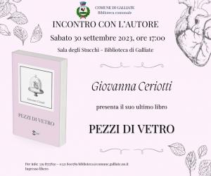 Galliate - Sabato 30 settembre, presso la Sala Stucchi della Biblioteca di Galliate alle ore 17.00, avrà luogo il nuovo appuntamento con la rassegna Incontri con l’Autore. Sarà protagonista dell’incontro Giovanna Ceriotti che presenterà il suo ultimo libro, dal titolo “Pezzi di vetro” uscito il 07 aprile 2023 per Golem Edizioni e presentato in assoluta anteprima al Book Pride di Milano.