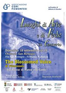 Villadossola - Nell’ambito di Editoria e Giardini, domenica 18 settembre, alle ore 18, si terrà presso l’Oratorio di San Remigio il concerto “Dal narrar di pietre e di Canti” di The Blossomed Voice di Villadossola. Il Concerto, a cura dell’Associazione Cori Piemontesi, sarà intervallato dalle “Noterelle Storiche” di Stefano Martinella. L’ingresso è gratuito. Per ulteriori informazioni: www.associazionecoripiemontesi.com.