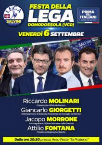 Domodossola - Il 6, 7 e 8 settembre nell'area festa della Prateria in Regione Nosere a Domodossola, avrà luogo la festa nazionale della Lega Piemonte. Tantissimi gli ospiti di spicco, tra i numerosi ospiti locali e nazionali sarà capofila il padrone di casa, Segretario della Lega Piemonte, Capogruppo alla Camera dei Deputati Riccardo Molinari, presente a tutte le serate insieme con gli storici esponenti del territorio, il senatore Enrico Montani, l’europarlamentare Alessandro Panza, il Capogruppo in Consiglio Regionale del Piemonte Alberto Preioni, non mancheranno quindi gli Assessori, i Consiglieri regionali, ed i parlamentari piemontesi tutti.