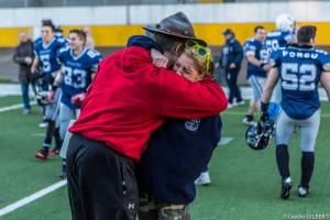 Milano - Incredibili Seamen. Vincono il loro sesto tricolore giovanile, il quinto della nuova era, realizzano la doppietta con il titolo IFL, conquistato lo scorso luglio e centrano un record di partecipazioni ai bowl e di successi, nell’ultimo lustro, che difficilmente avrà eguali in futuro. Sul campo di Pero i Marinai, ancora orfani di sua maestà Alessio Cavallini, gettano non solo il cuore oltre l’ostacolo, ma confermano tutto quanto dimostrato in regular season e nei play off con un Lorenzo Cazzamani nel ruolo d’insolito quanto prolifico quarter back dal numero di maglia 99 e una struttura di squadra ferrea, capace di sopperire ad ogni evento imprevisto, incluso il black out che getta nelle tenebre il teatro delle finali nazionali. Poco prima dell’avvento del buio, siamo a ridosso dell’intervallo, i ragazzi di Guido Cavallini si erano visti annullare un touchdown per una falsa partenza inopinata con il risultato acquisito sul momentaneo vantaggio di 6 a 0, merito dello stesso Cazzamani, in touchdown con una corsa da 5 yarde nel primo quarto di gioco. Chi si aspetta una finale ricca di suspence viene accontentato nella terza frazione di gioco quando prima i Warriors Bologna, degna e indomita avversaria, con una meta non trasformata di Di Muro, poi ancora una volta il regista meneghino, con un QB sneak da due yarde, trasformazione a cura di Ismail Lamamra, fissano lo score sul 13 a 6 per Milano. Nell’ultima frazione, dominata da un comprensibile nervosismo, arriva la stoccata vincente di Niccolò Pulsinelli, uno dei più positivi in questa fase del torneo, che una corsa da 12 yarde, sempre convertita da Lamamra, fissa il punteggio sul definitivo 20 a 6. Nel mezzo ci sono un’infinità di cose, alcune positive come i due intercetti messi a segno da Giovanni Gilberti, altre meno, come quelli realizzati dalla difesa felsinea, brava nel mettere le mani su un paio di palloni messi in aria da Cazzamani. In sede di consuntivo va messo in risalto non solo il talento delle tante stelle che popolano il roster blue navy, ma anche la bravura difensiva, una citazione d’obbligo va a Igor Timotijevic per quanto espresso nelle ultime partite e la solidità delle linee che nelle ultime partite, pur compiendo un lavoro oscuro all’occhio del tifoso, hanno saputo sovvertire in più casi l’esito dei match dando fiducia al proprio regista e ponendo pressione su quelli avversari. Incamerato il sesto tricolore della storia in ambito giovanile i Seamen possono ora concentrarsi sulla preparazione della prima squadra, in vista della IFL 2015, con la certezza che molti degli atleti visti oggi in campo avranno un futuro anche nella massima serie.