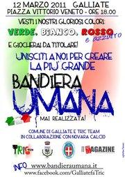Galliate - Scrive by Tric Team: "Manca pochissimo alla convocazione per la realizzazione della più grande bandiera umana d'Italia in programma nel centro galliatese nei pressi del Castello sabato 12 marzo! Ecco alcune informazioni utili: 1. l'evento si svolgerà sulla piazza antistante il Castello di Galliate e a tutti i partecipanti verrà consegnato un cartoncino 50x50 di colore rosso, bianco o verde su un lato e azzurro sull'altro. Tutte le istruzioni per la realizzazione della coreografia verranno fornite sul posto dagli speaker e dai volontari. 2. Sono previsti premi offerti da Immobiltrade di F. Duro per il partecipante più giovane, il più anziano e l'abbigliamento più simpatico e a tema! Via libera quindi alla fantasia e all'originalità nel prender parte all'evento vestendo i colori italiani. Ricordiamo che durante la manifestazione e per tutta la serata anche i locali del centro storico si "vestiranno" col tricolore e offriranno cocktail, bibite e assaggi a tema. Si ringrazia anche i commercianti per l'adesione con la realizzazione delle "vetrine tricolori" e i media locali (giornali, radio e tv) che saranno presenti all'evento. Ormai manca poco! Destati e vesti il tricolore anche tu!". Conferma la tua presenza su www.bandieraumana.it!