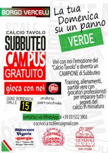 Borgo Vercelli - Tutte le domeniche pomeriggio, presso l’Oratorio Parrocchiale del paese, allenamenti, partite vere con giocatori professionisti per diventare i campioni di domani. Dopo il successo dell’anno scorso, torna per tutti gli appassionati grandi e piccoli del calcio in miniatura il Subbuteo Campus. L’evento, organizzato ancora un volta dal club TSC 69ERS di Borgo Vercelli, si svolge ogni domenica pomeriggio presso la sede dell’Oratorio Parrocchiale del paese in via P. Besate 2. Da qui sino ad agosto, le porte dello storico club vercellese si aprono per far conoscere e praticare gratis a chiunque lo voglia il Subbuteo – Calcio Tavolo.