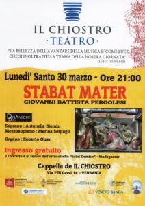 Primo appuntamento nella Cappella del Chiostro di Verbania Stabat Mater di Giovanni Battista Pergolesi. Proposto dal Duo Dinamiche: Antonella Biondo - Soprano e Marina Serpagli - Mezzosoprano; Roberto Olzer all'Organo. E’ un capolavoro. Il grido di dolore dell’uomo termina nel più grande Amen di tutta la musica: c’è un destino buono. Tutto di noi ha davanti il limite, solo Cristo toglie via questo limite, Egli salva il rapporto con la verità della vita che vibra in te in ogni attimo. Amen: sì. La vita ha un destino, perché Cristo è risorto qui nella realtà della storia. Amen: sì è un grido di gioia e di gloria