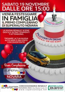 Novara - (i.p.) Le feste di compleanno hanno sempre un sapore molto particolare. Se poi la candelinada spegnere è solo una ecco che la festa diventa subito un evento. E per celebrare i primi 12 mesi di Superauto, concessionaria Renault e Dacia, a Novara il gruppo ha deciso di fare le cose in grande! È stato infatti organizzato un pomeriggio ricco di appuntamenti per grandi e piccini, con al centro dell’attenzione le splendide vetture in esposizione. Superauto si conferma un gruppo da sempre molto attento alle famiglie e proprio ad esse si rivolge sabato 19 novembre dalle 15 in poi. In programma nella sede di Novara in via Marie Curie 21 (zona via Biandrate) avremo infatti: droni, sfide ai videogames, zucchero filato, trucca bimbi, animazione per i più piccoli (che coinvolgerà anche i più grandi…), go-kart pronti per essere guidati, una merenda per tutti e un ricco aperitivo e infine, ma non per questo meno importante, la possibilità di poter provare l’ultima creatura di casa Renault: la nuova SCENIC.