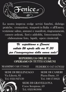 Cameri - (i.p.) Proprio nei momenti più difficili, quando viene a mancare una persona che ti è stata cara, hai bisogno di affidarti a personale assolutamente qualificato, che sappia il fatto suo e che soprattutto ti offra assistenza per tutto quanto concerne ‘l’estremo e ultimo saluto’. Per questo da sabato 26 aprile c’è un’opportunità in più per chi risiede a Cameri (non solo per i cameresi...). Nella centralissima piazza Dante nei pressi dell’incrocio con via Baracca apre Fenice Onoranze Funebri. “La nostra impresa - spiegano Massimo e Federico - ha un’esperienza di diversi anni e altre due sedi, a Bellinzago e Gravellona Toce. Ci occupiamo del disbrigo delle pratiche, di cremazioni, di trasporti in tutta Italia e anche all’estero; quindi vestizione delle salme, annunci, manifesti e ringraziamenti, allestiamo camere ardenti, prepariamo fiori e addobbi, fotoceramiche e opere cimiteriali”. Per info: tel. 348 1750621 - Massimo o 347 1678322 - Federico.