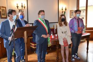 Borgomanero - Comune di Borgomanero e Fondazione Marazza hanno celebrato la Festa della Repubblica con una cerimonia che si è tenuta mercoledì 2 giugno, alle 10, nel Salone d'onore di Villa Marazza. La manifestazione è stata introdotta dal Presidente della Fondazione Marazza Giovanni Tinivella. I saluti dell’Amministrazione Comunale sono stati portati dal Vice Sindaco Ignazio Stefano Zanetta, in quanto il Sindaco Sergio Bossi era assente per motivi di salute, che ha letto le parole del Primo Cittadino indirizzate alla popolazione e ai giovani. Lo storico Gianni Cerutti ha poi illustrato il senso della celebrazione: è stata poi donata una copia della Costituzione ai neodiciottenni. A ritirarla simbolicamente per tutti i loro coetanei, che non erano presenti per i motivi legati alla pandemia, è stata una loro rappresentanza: la prima nata e il primo nato del 2003 (Sara Popa e Lorenzo Cerri) e gli studenti designati dalle scuole cittadine. Per l’Enaip: Elisa Machieraldo, Fiqerete Shaqja e Diego Simonotti. Iti “L. da Vinci”: Gioele Gudetti e Luana Trudu. Liceo Don Bosco: Marta Mora. Liceo Galilei: Marica Biondino, Andrea Facchin, Leonardo Piralli, Simone Sabatino e Beatrice Valsesia. Gli altri potranno ritirare la loro copia della Costituzione al Servizio Attività culturali a partire dal 14 giugno. Erano presenti gli Assessori Franco Cerutti e Francesco Valsesia. I consiglieri Massimo Zanetta, Manuel Cerutti, Roberto Faggiano e Valentina Zanetta.