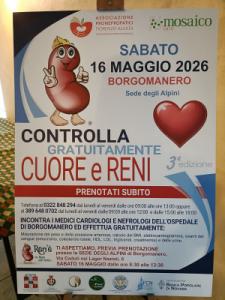 Borgomanero - Per il terzo anno consecutivo, sempre presso la sede degli Alpini di Borgomanero, l’Associazione Pronefropatici Fiorenzo Alliata A.P.S., presieduta dal Dott. Stefano Cusinato e l’Associazione Mosaico O.D.V. presieduta dalla dott.ssa Chiara Vicari, in collaborazione con le Strutture Complesse di Nefrologia, diretta dal dott. Stefano Cusinato, e di Cardiologia, diretta dal dott. Pierfranco Dellavesa, entrambe del Presidio Ospedaliero di Borgomanero dell'Asl Novara, promuovono la prevenzione per le malattie che coinvolgono il cuore ed i reni.