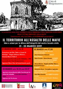 Borgomanero - Borgomanero dedica un convegno, in occasione della XXIV Giornata della Memoria e dell’impegno in ricordo delle vittime innocenti delle mafie, giovedì 21 e venerdì 22 marzo. Il Territorio all’assalto delle mafie, idee e azioni per la difesa dell’integrità del nostro tessuto civile, è il titolo degli incontri-dibattito che prenderanno il via giovedì 21 marzo, alle 21, con la proiezione (sala 3 del Cinema Nuovo) “Nato a Casal di Principe” per la regia di Bruno Oliviero. Introdurrà la serata il professor Riccardo Palladino dell’Itis da Vinci di Borgomanero. L’ingresso è libero.