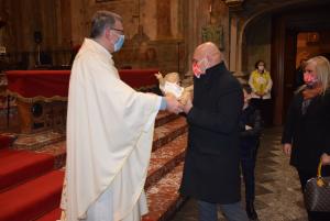 Borgomanero - Notte di Natale 2020. Come vuole la tradizione cittadina, il Sindaco Sergio Bossi ha partecipato alla "Messa di Mezzanotte", quest'anno anticipata alle 20 a causa delle misure contro la pandemia. Al termine della funzione religiosa, ha deposto il Bambino nella mangiatoia. Il presepe in piazza Martiri è stato allestito dal Gruppo cittadino degli Alpini.