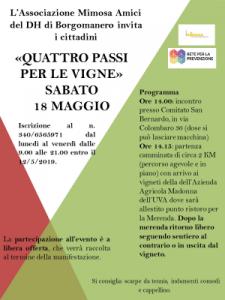 Sabato 18 maggio “Quattro passi per le vigne” è l’iniziativa che si terrà a Borgomanero, aperta alla popolazione, per promuovere l’esercizio fisico e comportamenti corretti volti a migliorare la qualità di vita. La camminata avrà inizio alle 14,00 con ritrovo presso il Comitato San Bernardo (via Colombaro, 36 a Borgomanero) in cui sarà possibile parcheggiare l’automezzo per iniziare un percorso di circa 2 km con arrivo ai vigneti dell’Azienda Agricola Madonna dell’Uva, dove sarà allestito un ristoro. Dopo la sosta per la “merenda” si potrà ripercorrere il percorso a ritroso oppure uscire direttamente dal vigneto.