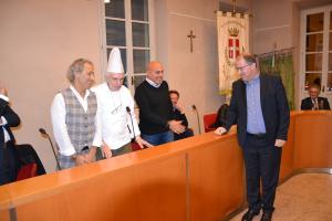 Borgomanero - Cerimonia di consegna, nel tardo pomeriggio di martedì 7 novembre nella sala consigliare di palazzo Tornielli, del ricavato delle serate (23,24,25 e 26 settembre) benefiche di “Stelle e Padelle”. Durante la cerimonia si è ufficialmente costituita l’Associazione “9 settembre – Allegra Brigata” con presidente Andrea Cane, vice Gianni Torraco e segretario Andrea Favergiotti. La manifestazione “Stelle e Padelle” giunta al sesto anno, ha raccolto una notevole somma distribuita in beneficenza. Per il 2023 le Associazioni che hanno ricevuto un contributo sono: Arca, Avis Alpini, Coro Stella Alpina di Berzonno, Pro Nefropatici “F.Alliata”, Gattile, Reparto di Ortopedia dell’Ospedale di Borgomanero e la chiesa di Santa Maria di Armeno. Alla cerimonia erano presenti oltre al Sindaco Sergio Bossi, gli Assessori Anna Cristina e Francesco Valsesia. “Stelle e Padelle” sarà presente, sempre con obiettivo beneficenza, il 29 febbraio del prossimo anno alla Prateria di Domodossola e, nel marzo 2024, a Napoli a favore dell’Ospedale Cardarelli.