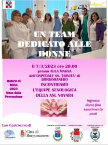 Borgomanero - L’Asl Novara in collaborazione con l’Associazione “Mimosa Amici del D.H. Oncologico di Borgomanero-ODV” e con il GIC senologico attiveranno nei prossimi mesi iniziative di prevenzione dei tumori della mammella attraverso l’organizzazione di visite senologiche gratuite dedicate alle donne sul territorio nei mesi di marzo e ottobre, mesi dedicati alla prevenzione in rosa. L’attività di prevenzione si è aperta il 7 marzo scorso con un incontro dal titolo “Un team dedicato alle donne” aperto alla cittadinanza e ai medici di medicina generale. Alla serata era presente numeroso pubblico che al termine ha posto diverse domande legate al tema. Erano presenti inoltre i rappresentanti delle Amministrazioni comunali aderenti all'iniziativa, il Sindaco di Gattico-Veruno Federico Casaccio, il Vice Sindaco di Gozzano Libera Ricci e l'Assessore alle Pari Opportunità di Castelletto Ticino Sonia Fanchini. Ha portato i salute della Città di Borgomanero l'Assessore Anna Cristina.