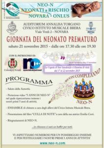 Per Sabato 21 novembre è in programma al Civico Istituto Musicale Brera, dalle 17,30 alle 19.30 ci sara' un momento di incontro pubblico per evidenziare alla cittadinanza le peculiarità di questa Giornata. Al saluto delle autorità, seguiranno gli interventi del Direttore Generale, Mario Minola, e del Direttore Sanitario, Gianenrico Guida, dell’Aou Maggiore della Carità, del professor Gianni Bona, direttore del Dipartimento Mamma e Bambino dell’Aou Maggiore della Carità, della dottoressa Federica Ferrero, direttore del reparto di Neonatologia, patologia e terapia intensiva neonatale dell’ Aou Maggiore della Carità, della presidente di Neo-N, Kosme' De Maria. L'incontro sarà anche l'occasione per festeggiare i primi 5 anni di attività di Neo-N che, grazie alla generosità di molti novaresi e grazie al sostegno di Fondazione BpN per il territorio, Fondazione Comunità del Novarese, Igor, Comoli Ferrari, e altri, ha donato diversi strumenti utili al reparto compresa la Ret-Cam, apparecchiatura all'avanguardia e di ultima generazione che consente la diagnosi precoce della retinopatia sui neonati prematuri evitando loro il trasporto a Torino. Della nuova apparecchiatura, operativa da qualche mese al Maggiore, parlerà il direttore di Oculistica, dottor Stefano De Cillà.