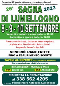 Lumellogno - Ventiseiesima edizione per la Sagra di Lumellogno organizzata dalla Parrocchia dei Santi Ippolito e Cassiano, in collaborazione con l’Oratorio Pier Lombardo Anspi e la Pro Loco Lumellognese. La manifestazione si terrà nel cortile parrocchiale venerdì 8 e sabato 9, a cena dalle 19.30, e domenica 10 settembre, a pranzo dalle 12.30. Per l’occasione è proposto un menu con i rinomati piatti della tradizione, tra i quali: paniscia novarese, pesciolini fritti, spezzatino d’asino con polenta, gorzonzola, salame della duja. Non mancherà l’angolo con grigliate, panini e patatine.