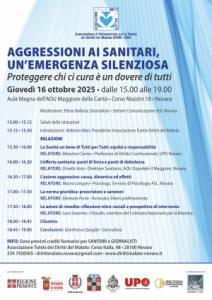 Novara - Giovedì 16 ottobre, dalle ore 15 alle 19, presso l’Aula Magna dell’AOU Ospedale Maggiore di Novara (Corso Mazzini 18), l’Associazione per la Tutela dei Diritti del Malato, con il patrocinio di autorevoli enti istituzionali, organizza il convegno dal titolo “Aggressioni ai sanitari, un’emergenza silenziosa – Proteggere chi ci cura è un dovere di tutti”. L’iniziativa, moderata dalla giornalista Elena Vallana, vedrà la partecipazione di rappresentanti delle istituzioni, esperti di diritto, sanità, psicologia ed etica, per analizzare il fenomeno crescente delle aggressioni al personale sanitario, le cause, le conseguenze e le possibili strategie di prevenzione e contrasto. Il programma prevede interventi di: