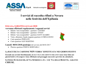 Novara - Sabato 6 gennaio 2018, giorno dell'Epifania, Assa effettuerà i servizi di raccolta differenziata dei rifiuti "non recuperabili" nei quartieri Centro, Ovest, Sant'Agabio, del vetro nel quartiere di Lumellogno, della carta nei quartieri di Pernate e San Martino.