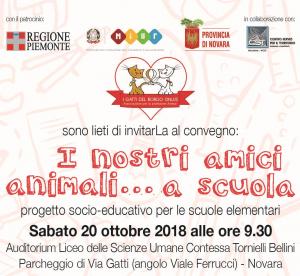 Novara - Convegno "I nostri amici animali... a scuola", un importante momento di confronto su come gli animali possono essere utilizzati nell'attività didattica, con particolare attenzione ai disabili. Appuntamento sabato 20 ottobre all'auditorium del liceo delle Scienze Umane di Novara (ingresso dal parcheggio di via Gatti, angolo viale Ferrucci a Novara) alle ore 9.30. Tra i relatori: Simona Cullati (presidente associazione "I gatti del borgo", onlus che organizza l'iniziativa), il presidente della Provincia di Novara Matteo Besozzi, l'assessore regionale alle Politiche sociali Augusto Ferrari, il direttore del progetto Lucuano Langella, il direttore del dipartimento di Veterinaria dell'Università di Torino Domenico Bergero, il direttore del Servizio veterinario dell'Asl di Novara Franco Tinelli, Gabriella Colla per l'Ufficio scolastico provinciale, Enrico Piacenza coordinatore regionale OIPA.
