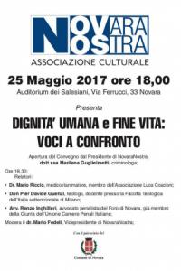 L’Associazione NovaraNostra vuole offrire alla città un’occasione di pacata riflessione su questo tema Giovedì 25 maggio alle 18 presso l’Auditorium dei Salesiani in via Ferrucci 33 a Novara con un convegno dal titolo “Dignità umana e fine vita: voci a confronto”.