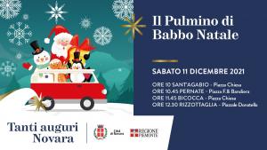 SABATO 11 DICEMBRE Arriva Babbo Natale! Babbo Natale a bordo di uno speciale pulmino porterà gli auguri del Comune e regali ai bambini di Novara. Primo appuntamento, sabato 11 dalle 10 alle 13: ore 10 SANT'AGABIO (Piazza Chiesa); ore 10.45 PERNATE (P.za F.lli Bandiera); ore 11.45 BICOCCA (Via XXIII Marzo Piazzale Chiesa); ore 12.30 RIZZOTTAGLIA (Piazzale Donatello). Dalle 15.30 alle 18.00. Vie del centro città Incursioni musicali dei Dixieland – La Band dei Babbi Natale. Dalle ore 10 alle ore 12.30: posizionamento all'interno di uno dei padiglioni del Mercato Coperto del “Photobus di Natale” dove i bambini potranno farsi fotografare insieme a Babbo Natale con divertenti accessori photo booth e ricevere la foto stampata con logo personalizzato del Mercato Coperto.