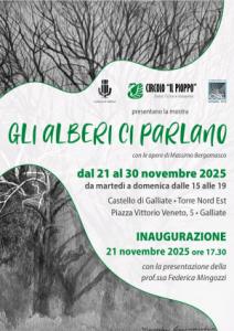 A Galliate la Festa dell’Albero si apre il 21 novembre alle 17:30 al Castello con l’inaugurazione della mostra “Gli alberi ci parlano”, dedicata alle opere dell’artista Massimo Bergamasco e visitabile fino al 30 novembre dal martedì alla domenica dalle 15 alle 19. Un invito alla riflessione sul rapporto tra persone e natura, che il Circolo considera un tassello importante della sensibilizzazione ambientale.