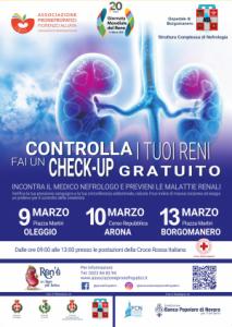 “Fai con noi un check-up gratuito per la salute dei tuoi reni” è lo slogan della Giornata, che vede presente nelle piazze di Oleggio, Borgomanero e Arona un presidio della Struttura di Nefrologia in sinergia con la Croce Rossa Italiana, con il supporto operativo dell’Associazione Pronefropatici Fiorenzo Alliata A.P.S. di Borgomanero e la collaborazione del Laboratorio Analisi.