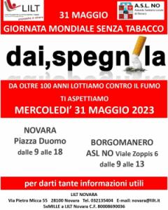 Novara - Mercoledì 31 maggio è la Giornata mondiale senza tabacco: come sempre la Lega italiana per la lotta contro i tumori – Sezione provinciale di Novara scenderà in campo con Asl Novara per sensibilizzare contro le conseguenze negative del fumo sulla salute. Gli operatori del Centro per il trattamento del tabagismo dell'Asl No e i volontari Lilt saranno a Novara in piazza Duomo dalle 9 alle 18 a Borgomanero all'ingresso dell'ospedale SS Trinità, in viale Zoppis 10, dalle 9 alle 13. Sarà distribuito materiale informativo sul tabacco e sui prodotti alternativi come le sigarette elettroniche che pure causano numerosi effetti nocivi. Chi lo vorrà si potrà inoltre sottoporre a un test per rilevare il grado di dipendenza fisica da nicotina.