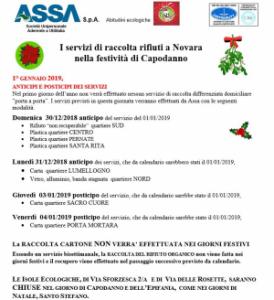 Novara - I servizi di raccolta rifiuti a Novara nella festività di Capodanno, anticipi e posticipi dei servizi: nel primo giorno dell’anno non verrà effettuato nessun servizio di raccolta differenziata domiciliare “porta a porta”. I servizi previsti in questa giornata verranno effettuati da Assa con le seguenti modalità. Domenica 30/12/2018 anticipo del servizio raccolta rifiuto “non recuperabile” al quartiere Sud e plastica nei quartieri Centro, Pernate, Santa Rita.