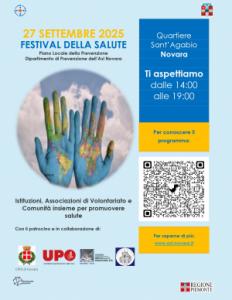 Novara - Parte sabato 27 settembre la terza edizione del Festival della Salute che rappresenta un appuntamento consolidato di incontro con la popolazione dell’intero territorio novarese, promosso nell’ambito del Piano Locale della Prevenzione. Il primo evento è previsto a Novara nell’ambito della festa tradizionale del Quartiere di Sant’Agabio nella giornata di sabato 27 settembre dalle 14.30 alle 19, promosso con il patrocinio del Comune di Novara, dell’Università del Piemonte Orientale, del Centro Servizi per il Territorio Novara e Vco, della Parrocchia e vede la partecipazione di numerose Associazioni di Volontariato del territorio e Istituzioni.