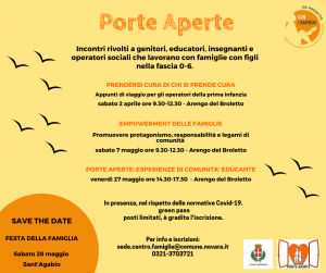 Il progetto Porte Aperte, finanziato dall’Impresa sociale ‘Con i bambini’ e attivo dal 2018 nel contrasto alle povertà educative, ha sempre avuto particolare attenzione alle famiglie con bambini fino a 6 anni d’età ed in questi 4 anni è stato organizzatore e portavoce sul territorio di molte esperienze di comunità educante. Capofila del progetto è il Comune di Novara, con i servizi educativi della fascia 0-6, asili nido e Centro per le Famiglie. Il partenariato è composto da enti pubblici ed enti del terzo settore: ASL, scuole dell’infanzia Sulas e Ricca, Parrocchia di Sant’Agabio, Casa Circondariale, Cooperativa l’Albero a Colori, OrientaMente E.T.S./a.p.s. e l’Università Cattolica del Sacro Cuore. Il progetto chiuderà a metà luglio 2022.