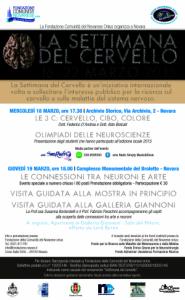Novara, a tal proposito, propone importanti appuntamenti: il primo è fissato per Mercoledì 18 Marzo alle 17.30 all’Archivio di Stato di Novara con il Convegno “Le 3 C: cervello – cibo – colore” cui parteciperanno il Dott. Federico D’Andrea, Presidente dell’Ordine dei Medici di Novara, il Dott. Aldo Biolcati (Responsabile Malattie Neurodegenerative - sezione Aging - Società Europea e Italiana Salute Medicina di Genere - Coordinatore Scientifico A.M.A. Novara onlus) che accompagneranno il pubblico nel curioso labirinto dei rapporti tra mente, alimentazione e impatto dei colori e la Prof. Rita Trisoglio del Liceo scientifico “A. Antonelli” che andrà a presentare la nuova edizione delle Olimpiadi delle Neuroscienze. Al pomeriggio sarà presente anche Anna Pan, studentessa che si è classificata sesta all’International Brain Bee, le Olimpiadi delle Neuroscienze nel 2014, e che ha rappresentato l’Italia nella finale del concorso a Washington. Durante l’incontro, l’emittente SMSRadio sarà in diretta per realizzare interviste agli studenti.