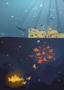 Gli aptaDiR rappresentano una nuova frontiera terapeutica nella medicina di precisione per bloccare il cancro. Nell'immagine stilizzata curata dall’illustratrice Laura Seclì, gli AptaDiR sono rappresentati come esche d'oro di un tesoro nascosto, capaci di arrestare e prevenire l'assedio dei granchietti (metaforicamente cellule tumorali) alla meravigliosa città sommersa (metaforicamente espressione della vita umana).
