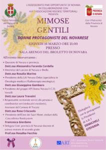 Novara - Si svolgerà giovedì 16 marzo alle ore 21 presso la Sala Arengo del Broletto l’incontro dal titolo “Mimose gentili. Donne protagoniste del Novarese”, promosso da Assessorato pari opportunità in collaborazione con Art Associazione Risorse territoriali con il patrocinio di Comune di Novara e Provincia di Novara. All’evento interverranno: - Alessandra Faranda Cordella, Questore di Novara; - Rosalia Marino, Direttrice del Carcere di Novara e Biella; - Giuseppina Gambaro, Presidente Lilt Novara Onlus; - Laura Travaini, Presidente Api Donna Novara Vco Vercelli; - Rosa Criscuolo, responsabile territoriale servizi alla persona e coordinatrice servizi educativi e scolastici Comune di Trecate; - Francesca Giordano, Presidente Enti Sacri Monti, titolare della Casa Editrice Booksystem; - Rosalba Fecchio, Presidente Coni Novara.