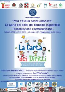 Durante il convegno la dott.ssa Enoc illustrerà i punti essenziali della “Carta dei diritti del bambino inguaribile”, che costituisce un documento basilare per la tutela del diritto alla cura per i bambini affetti da patologie croniche o invalidanti. La Carta afferma alcuni principi inviolabili, oltre a fornire linee guida e indicazioni pratiche essenziali per gli operatori del settore. Al termine della relazione della dott.ssa Enoc si terrà una tavola rotonda. Vi parteciperanno il dott. Mauro Zaffaroni, Direttore ff SCDU Pediatria AOU e il dott. Maurizio Viri, Responsabile SSD Neuropsichiatria Infantile AOU, che modereranno la sezione, la dott.ssa Maria Eleonora Basso, Referente amb. Oncoematologico SCDU Pediatria AOU affiancata dalla dr.ssa Federica Pritoni, Psicologa, il dott. Oscar Nis Haitink, Direttore della SC Pediatria Ospedale di Borgomanero, la dott.ssa Federica Ferrero, Direttore della SC Terapia Intensiva Neonatale AOU, la dott.ssa Emanuela Balzano, rappresentante dei Pediatri di libera scelta della nostra ASL e la Dr.ssa Kosmè De Maria, Presidente NEON_N, in rappresentanza delle Associazioni di volontariatooperanti in ambito pediatrico.