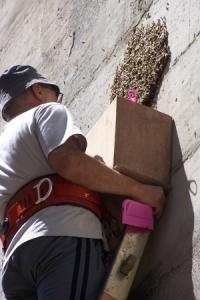 Novara - Ha destato non poca preoccupazione il super-alverare sviluppatosi lungo una parete del silos per il parcheggio delle automobili in via dei Mille (pieno centro storico novarese, a due passi dalla sede dell'Asl). Si è stimato che all'interno dell'alveare ci fossero addirittura oltre diecimila api! Una cifra decisamente considerevole. Per cercare di spostare la 'casa delle api', in particolare dell'ape regina, è stato chiamato un noto apicoltore di Cavaglio che dalle 11 del mattino sino alle 19 ha lavorato a lungo e con molta calma e cautela per spostare prima l'ape regina, poi tutti gli altri 'inquilini' senza far sì che nessuno (insetti compresi) si facesse del male. Del fatto sono stati informati sia i Vigili del Fuoco che la Polizia municipale di Novara. Dopo le 20 la situazione è tornata assolutamente alla normalità. Nella foto di Massimo Zoccante si vede l'apicoltore all'opera. La galleria fotografica è su https://www.facebook.com/media/set/?set=a.10201156577347025.1073741836.1547657710&type=3&uploaded=28