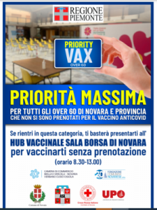 Prima giornata, venerdì 18 giugno, di somministrazione del vaccino agli over 60 senza prenotazione e “senza fila”. E l’iniziativa, chiamata Prority Vax, partita in via sperimentale da Novara, prima città in Piemonte, che ha incontrato il favore di quanti per vari motivi non si sono ancora vaccinati, ora fa scuola e diventa un modello da replicare su tutta la regione. Sono state una quarantina le persone che, residenti a Novara e provincia, questa mattina si sono presentate, dalle 8.30 alle 13 all’hub vaccinale del salone Borsa e che, senza prenotazione, hanno ricevuto una dose di vaccino Johnson&Johnson. E mentre a Novara il “Priority Vax” proseguirà, con il medesimo orario, fino a domenica 27 giugno compresa, da lunedì 28 il “modello novarese” verrà adottato in tutta la regione Piemonte.