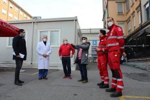 Novara - E’ stata posizionata questa mattina la tenda offerta dal Comitato provinciale della Croce rossa italiana: è stata sistemata nei pressi del Pronto soccorso dell’azienda ospedaliero-universitaria di Novara. In un momento in cui la pressione sull’ospedale è a un notevole livello, la tenda servirà da area di decompressione nel caso di massiccia affluenza al Pronto soccorso. Erano presenti al posizionamento di stamane il sindaco di Novara Alessandro Canelli, il responsabile del Pronto soccorso (nonché rettore dell'Upo) Giancarlo Avanzi, il presidente del Comitato provinciale Cri Paolo Pellizzari, il dg dell'Aou Maggiore della Carità Mario Minola e due volontari.