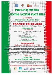 Novara - Pro Loco Novara organizza a beneficio del Centro Anziani di Santa Rita il Pranzo Tricolore, evento che gode del patrocinio di Comune di Novara, Provincia di Novara, l'Associazione provinciale e Regionale dei Vigili del Fuoco che per l'occasione organizza Pompieropoli, esposizione dei veicoli e percorso didattico a beneficio di grandi e piccini. Il Tempio della Danza animerà il pubblico presente con un evento Country mentre la Latteria di Cameri e Igor offriranno il gorgonzola. Il pranzo prevede spezzatino di capriolo con polenta e altre leccornie, per i bambini è previsto un menù bambini. L'evento si terrà in via Roggia Ceresa 23 presso il giardino della Casa del Quartiere domenica 10 aprile e in caso di maltempo l'evento sarà spostato al 24 aprile. È gradita la prenotazione.