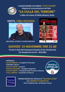 Novara - Giovedì 15 novembre alle ore 21 presso la Sala del Compasso di Novara, il celebre giornalista, scrittore e inviato televisivo Toni Capuozzo presenterà il suo ultimo libro “La culla del terrore”. Una testimonianza d’eccezione per un incontro organizzato dall'Associazione Culturale “Città Futura” dove l'autore racconterà in prima persona cercando di spiegare come è nato il terrore in nome di Allah, quando e dove. Le origini dell’attuale terrorismo islamista, delle bandiere nere dell’ISIS, della guerra santa dello stato islamico e dei suoi seguaci contro gli infedeli occidentali, vengono raccontati in questa prima, autentica opera di graphic journalism italiana.