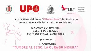Novara - In occasione del mese ‘Ottobre rosa’, dedicato alla prevenzione e alla lotta del tumore al seno, Il Comune di Novara Salute Pubblica e Assessorato alla Cultura, presenta il convegno dal titolo ‘Tumore al seno: la cura su misura’ in programma lunedì 30 ottobre alle 17.30 presso il salone Arengo del Broletto. Moderatore degli interventi il dottor Ivan Dodaro responsabile dell’Unita' di Senologia all’AOU Maggiore della Carità di Novara. Presentano Luca Piantanida assessore alla Cultura del Comune di Novara e Maria Cristina Stangalini presidente della VIIa Commissione Consiliare ‘Salute pubblica’ del Comune di Novara.