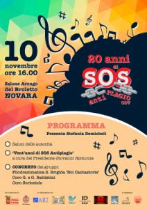 L’appuntamento per i festeggiamenti è domenica 10 novembre alle 16.00 presso il Salone dell’Arengo del Broletto a Novara. L’incontro, patrocinato dalla Provincia e dal Comune di Novara, è aperto a tutti e sarà presentato da Stefania De Marchi, Presidente dell’associazione A.R.T di Arona a cui seguiranno i saluti delle autorità. Poi si entrerà nel vivo con l’intervento del Presidente di SOS Antiplagio Giovanni Ristuccia che illustrerà brevemente il ventennio percorso dalla sua associazione, toccando i passi più salienti e ringraziando le associazioni presenti con cui ha avuto collaborazione. A seguire un momento musicale con la Filodrammatica di Santa Brigida (Bergamo) con le Cantastorie Carla Zolari e Mariagrazia Busi e il Coro Scricciolo e Coro Battistini diretti dal M.tro Giuseppe Tosatti. Si concluderà il pomeriggio con un bel brindisi conviviale.