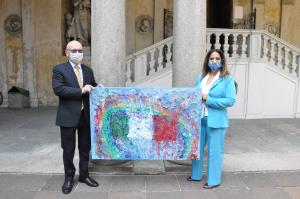 Novara - Un quadro astratto, realizzato da una pittrice di Castello di Brianza (Lecco) è stato donato all’azienda ospedaliero-universitaria di Novara: l’artista, Ausilia Minasi, l’ha consegnato sabato mattina al direttore generale dott. Mario Minola. “Il rosso del sangue imbratta i camici candidi, orfani della verde speranza” è il titolo che la pittrice ha voluto dare all’opera realizzata lo scorso anno «ad onore e gloria – ha detto Minasi – di tutti quei medici che hanno pagato con la vita il loro sacrifico». Ausilia Minasi aveva incontrato il dott. Minola lo scorso settembre alla mostra collettiva “L’arte combatte il Covid” che si era tenuta al Broletto: «Avevamo parlato di tutto quello che stava succedendo e allora mi è venuta l’idea di donare all’ospedale di Novara un mio quadro, un piccolo gesto d’amore nei confronti di chi tutti i giorni è in prima linea». E sabato l’opera è stata consegnata e campeggerà nell’aula magna dell’Aou.
