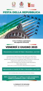 Novara - Domani, venerdì 2 giugno, Festa della Repubblica, Novara ospiterà la cerimonia ufficiale con ritrovo alle 9.45 presso il Monumento ai Caduti di viale IV Novembre. Il programma prevede lo schieramento delle forze armate, delle forze dell’ordine, dei corpi di soccorso pubblico, dei medaglieri e dei labari; l’alzabandiera solenne accompagnato dalle note dell’inno nazionale; la deposizione delle Corone al monumento; lettura del messaggio del Presidente della Repubblica; saluti delle autorità; esecuzioni musicali da parte della Banda di Grignasco. Sempre al Monumento dei Caduti, alle ore 19, è prevista l’ammainabandiera da parte del picchetto militare La Cupola sarà illuminata con il tricolore.