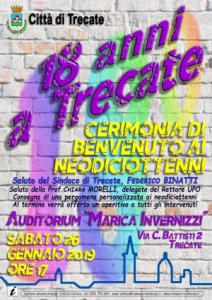 Trecate - L'Amministrazione comunale organizza sabato 26 gennaio alle ore 17 presso l'Auditorium “Marica Invernizzi” in via Cesare Battisti 2 la cerimonia “18 Anni a Trecate”. "È una giornata di festa importante - spiega la consigliera delegata Patrizia Dattrino - per riconoscere ai giovani Trecatesi il traguardo dei 18 anni, momento in cui si diventa Cittadino adulto e si acquisiscono i pieni diritti e doveri. Il Sindaco, Federico Binatti, giovane tra i giovani, accoglierà con piacere l’ingresso nella nostra comunità di questi ragazzi che sono il futuro su cui dobbiamo contare. Sarà presente per un saluto anche il delegato del Rettore dell'Università del Piemonte Orientale le Prof. Chiara Morelli. Al termine della cerimonia sarà offerto un aperitivo a tutti i partecipanti".