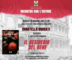 Galliate - Giovedì 30 maggio alle ore 21 la stagione primaverile della rassegna Incontro con l’Autore si chiude con l’autrice novarese Donatella Brusati, che presenterà il suo ultimo romanzo, Il desiderio del bene, pubblicato in aprile da Morellini Editore.