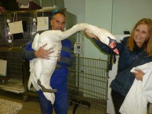 Trecate - ANPANA Novara libera un cigno reale adulto sulle sponde del fiume Ticino a Trecate (NO). "Pochi giorni prima - raccontano dal gruppo di guardie eco zoofile novaresi - alcuni operatori delle Ferrovie addetti alla manutenzione dei binari contattano la sede FS di Torino, che a sua volta ci chiede come intervenire per un cigno immobile sui binari. Dal comando Guardie Ecozoofile di ANPANA Novara viene spiegato di consegnare l’esemplare in clinica veterinaria a Romentino per uno stallo temporaneo. Vista la tarda ora non era possibile trasportare immediatamente il cigno presso il Wwf di Vanzago (MI). In clinica è stato sistemato in una gabbia di degenza in quanto non dava segni di reazione. È stato prelevato da 3 guardie visto il peso e la mole circa 10 kg e trasportato in uno spazio adibito con della paglia, del cibo e abbondante acqua per trascorrere la notte. Accudito da una guardia in loco. Il giorno successivo si presentava reattivo e in apparenza senza problemi riscontrabili alla manipolazione. Per evitare ulteriore stress da trasporto a Vanzago si è deciso di tenerlo ancora sotto osservazione. Dopo due giorni si presentava sveglio, reattivo, una buona apertura alare, soffiava alla presenza degli agenti ANPANA e si era cibato, aveva sporcato e bagnato nell’acqua. Ha fatto capire che non intendeva rimanere rinchiuso. Senza indugio si è catturato, con cautela, e trasportato nelle vicinanze del luogo del ritrovamento. Dopo alcuni tentennamenti è entrato in acqua si è guardato intorno, ha emesso dei versi di richiamo, si è ripulito, ha immerso il collo nel fiume, ha frullato le ali e con grande ammirazione delle tre guardie che lo hanno liberato ha preso il volo".