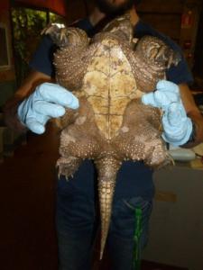 Oleggio - Una tartaruga ''azzannatrice'' (Chelydra serpentina) d’acqua dolce, maschio di circa 10 anni è stata sequestrata dalla Polizia Locale di Oleggio. Avvistata da un privato in una strada di campagna, caricata incautamente in auto, ha incominciato a muovere la lunga coda ed estendere il collo come un serpente in direzione del conducente. Trattandosi di specie esotica e alloctona originaria del Nord America, è considerata dalla legge italiana tra quelle più pericolose per la salute e l’incolumità pubblica. Prettamente carnivora predilige fondali fangosi, è devastatrice della fauna fluviale e invasiva per l’ecosistema nostrano. E’ in grado di sferrare morsi che ricordano il serpente con scatti fulminei, ha il corpo robusto, il carapace increspato, la lunga coda e il becco a uncino.
