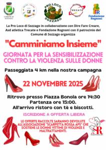 Sozzago - In occasione della Giornata internazionale per l'eliminazione della violenza contro le donne, il Comune di Sozzago ha patrocinato la manifestazione organizzata dalla Pro Loco Sozzago in collaborazione con ASD Atletica, il laboratorio Dire Fare Creare e Fondazione Coniugi Rognoni 'Camminiamo Insieme'. Si tratta di una passeggiata per sensibilizzare l'opinione pubblica sull'importanza della non violenza e del rispetto delle donne e manifestare la nostra solidarietà alle donne vittime di violenza. Rompiamo il silenzio e anche Noi diciamo No! L'appuntamento è per sabato 22 novembre. Il ritrovo è fissato in piazza Bonola alle ore 14.30; la partenza della passeggiata di 4 chilometri nella campagna che circonda Sozzago si tiene alle 15. All'arrivo spazio per un ristoro con tè e biscotti.