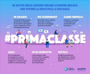 Forti dei riscontri pervenuti dalla nostra rete di scuole in tutta Italia, oggi rilanciamo la campagna #PRIMACLASSE partita lo scorso maggio. Si tratta di semplici regole di buonsenso, troppo spesso dato per scontato, ma sempre più latente nelle nostre relazioni digitali. In questi anni abbiamo imparato che il web non è uno strumento, bensì un luogo. Uno spazio che può e deve essere governato dai medesimi principi universali che tutti condividiamo nel mondo fisico. Fino a pochi mesi fa nessuno dei nostri figli si sarebbe sognato di andare a scuola in pigiama, eppure sono tanti, troppi, i professori che ci hanno raccontato di lezioni online con ragazzi connessi direttamente dal letto, magari dopo aver fatto le ore piccole sui videogame. Comportamenti che non solo condizionano il rendimenti scolastico, ma che incidono pesantemente sul percorso di crescita dei nostri figli.