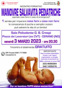 Cerano - Passato il periodo di restrizioni, la CRI Trecate torna a tenere i suoi corsi gratuiti alla popolazione con l'intento di diffondere capillarmente una cultura dell'educazione sanitaria e formare le persone per poter risolvere alcune situazioni di primo soccorso che potrebbero altrimenti evolvere in tragedie. Si riparte da Cerano, Sala Crespi, venerdì 3 marzo ore 20.30 con l'incontro formativo denominato "Manovre salvavita pediatriche", appuntamento che in passato è sempre stato accolto con grande entusiasmo dai cittadini.